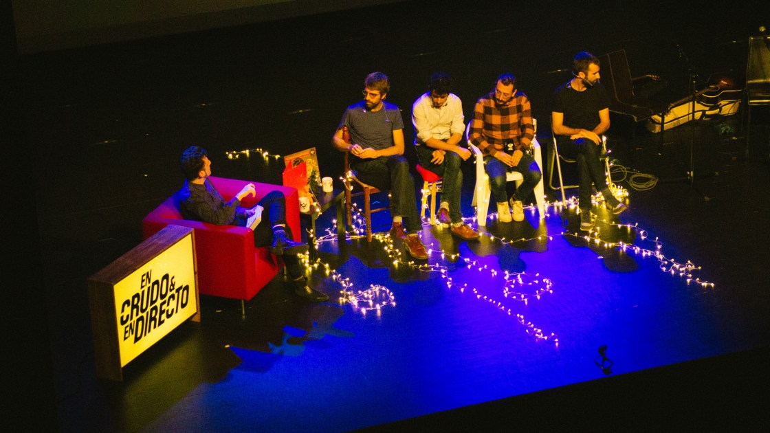 Gracias a Carne Cruda pudimos ver en el escenario de la Barts a Manel en un mix de entrevista y acústico en un evento muy muy diferente. Destacamos antes que nada una puesta en escena más que acertada. En pocas palabras se trataba de una recreación de la primera portada del primer disco Manel, también llamado “Els Millors Professors Europeus”. Por lo que al entrar los músicos se sentaron en las cuatro sillas que correspondían a la icónica imagen y que por lo tanto eran un taburete, dos sillas de plástico y otra de mimbre.